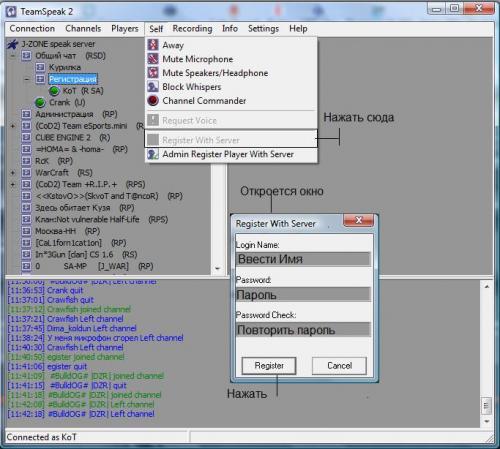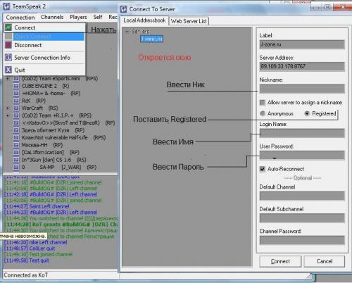 | | | 1. Настройка и соединение Для начала надо запустить ТС. Сначала лезем в Connection->Connect В зоне слева нажимаем правую кнопку мыши и выбираем пункт "Add Server". Создастся новая запись в записной книжке. Теперь ее надо заполнить. Кликаем по этой новой записи, в правом столбце появятся параметры этой записи. Теперь по порядку, что куда нужно вбить: 1. Для начала необходимо указать адрес сервера. 213.24.0.164:8767 2. Далее надо указать ник, под которым вы будете показаны на сервере. 3. Если вы пользуетесь этим сервером впервые, или не имеете на нем учетной записи, следует указать, что вы анонимный пользователь (поставить галочку). 4. Если у вас есть учетная запись на сервере - следует указывать что вы зарегистрированный пользователь, и указать логин/пароль учетной записи Примечание: ник и логин это разные вещи, и не обязаны совпадать. Ник можно изменить в любой момент, а логин остается прежним. Если вы захотите поменять ник - новую учетную запись регистрировать НЕ СЛЕДУЕТ. Надо просто поменять ник. Перемещаться между каналами - двойной клик на название канала. 2 Настройки микрофона в windows 1. Зайдите в панель управления, и выберите "звук и аудиоустройства" 2. Открываем вкладку "речь" – "запись речи" – нажимаем "громкость". 3. Откроется микшер – в нем необходимо поставить галочку под рычажком, отвечающим за микрофон. Все остальные галочки необходимо снять. Тут же рычажком можно регулировать чувствительность микрофона. В зависимости от модели и расстояния до него она может быть различна. | |